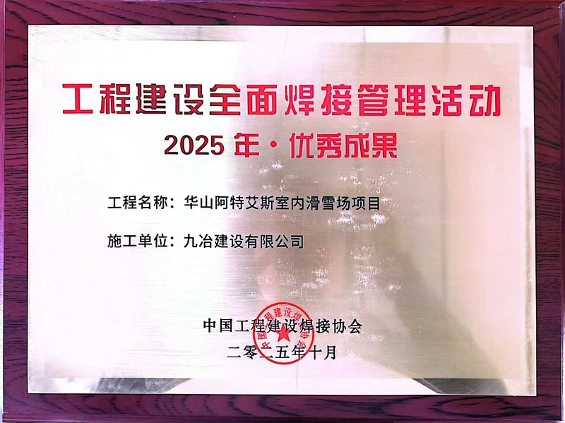 近日,由九冶钢构公司承建的华山阿特艾斯室内滑雪场工程凭借规范高效的全面焊接管理、精益求精的施工工艺与过硬工程质量,成功荣获“工程建设全面焊接管理活动优秀成果”奖。该奖项不仅为项目施工画上圆满句号,也充分彰显了公司在大跨度钢结构施工领域的技术实力与行业积累。