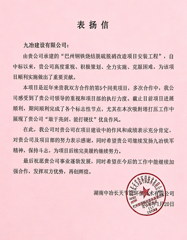 1月20日,湖南中冶长天节能环保技术有限公司发来表扬信,对九冶在巴州钢铁烧结脱硫脱硝改造项目安装工程中“敢于亮剑、能打硬仗”的优良作风给予表扬。