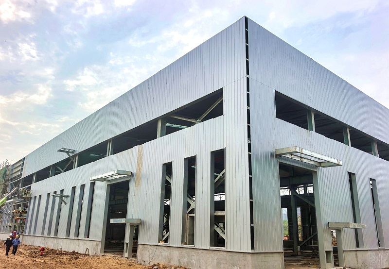 当前,现场施工主要围绕以下区域展开:1#厂房1-6轴高支模拆除后,正进行砌体、构造柱、圈梁等二次结构施工,为水电预埋及装饰创造条件;7-14轴安装外墙彩板,拼接、收边等工序按图施工,封闭防水效果良好。2#厂房外墙装饰进入收尾,龙骨、保温层及饰面板同步推进,立面效果初现。